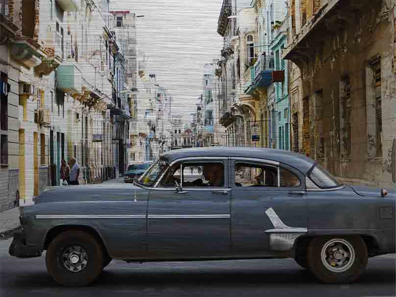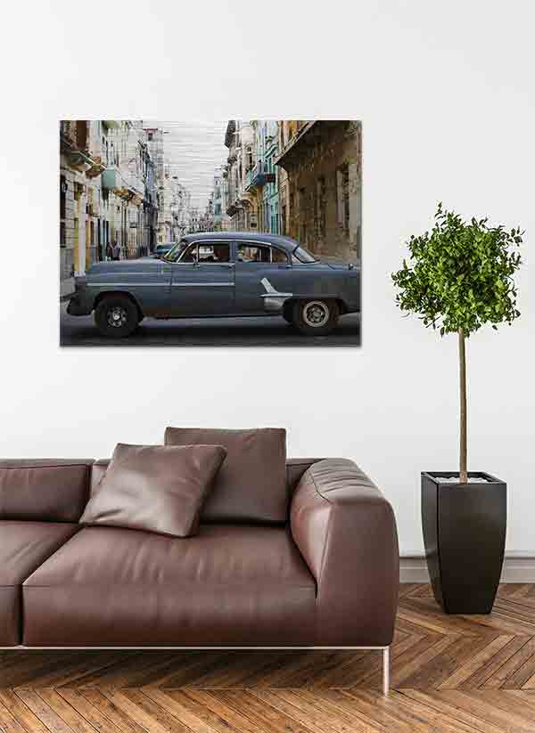 Ein seltener Oldtimer, der über eine Straßenkreuzung in Havanna fährt. Eine reduzierte Farbkomposition, ideal kombinierbar mit vielen Einrichtungsstilen. Als Druck auf Alu Dibond Butlerfinish Silber und als Transfer auf Holz in verschiedenen Formaten erhältlich.