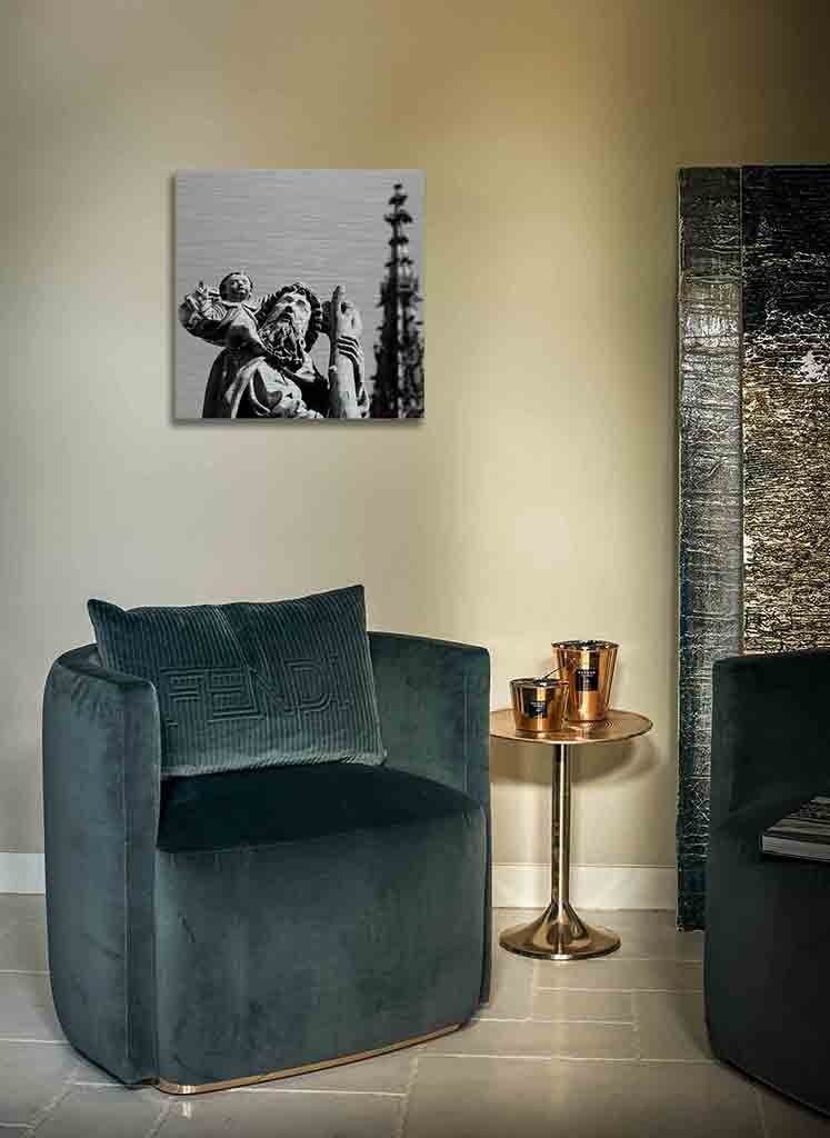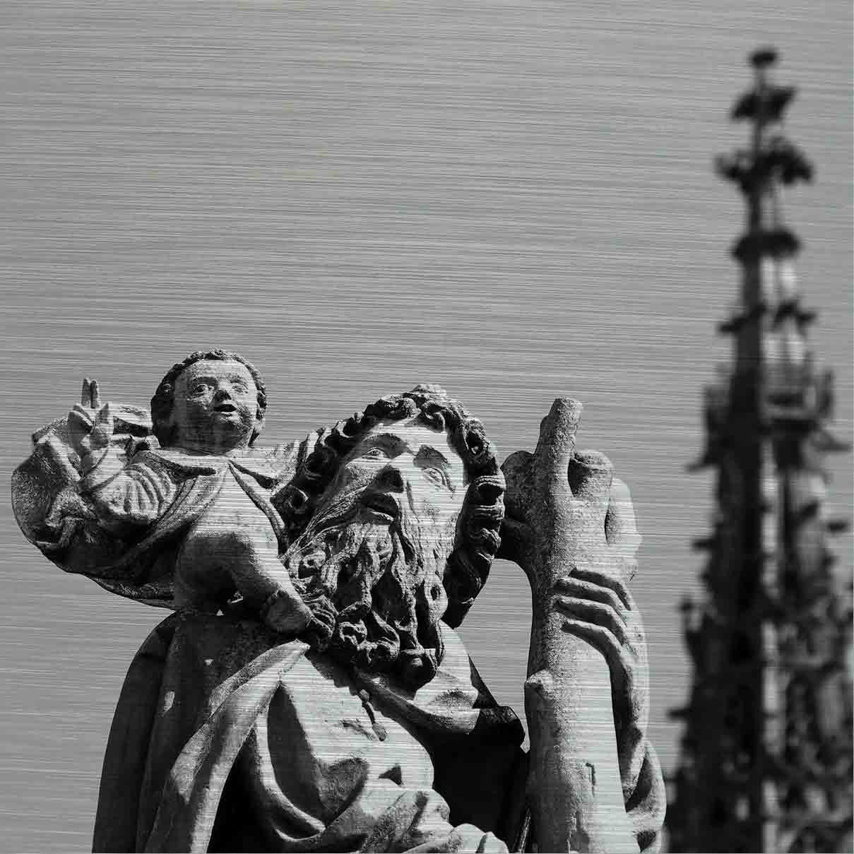 Zwei Wahrzeichen Ulms in einer Fotografie: die Skulptur des Hl. Christopherus und die Turmspitze des berühmten Ulmer Münsters im Hintergrund, beides Meisterwerke der Gotik, vereinen sich zum Zeugnis vergangener Steinmetzkunst. In schwarz-weiß eine edle Wanddeko, die alle Zeit überdauert.